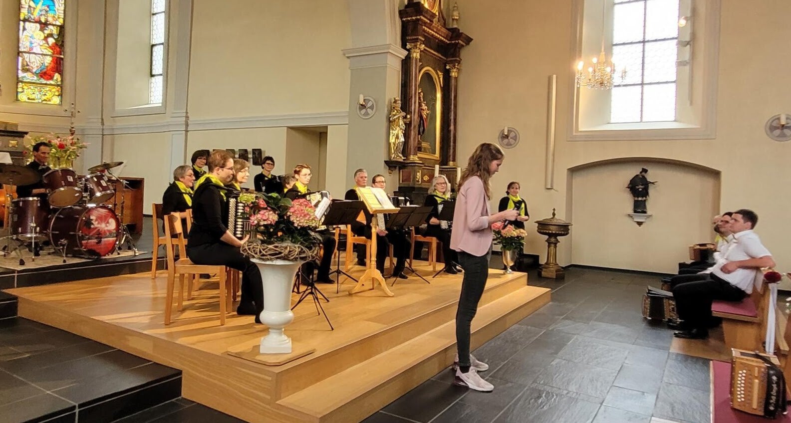 Eine grosse Anzahl Zuhörer pilgerte am Muttertag in die schöne Kirche von Wölflinswil zum Konzert des Akkordeonorchesters Frick. Eröffnet wurde der bunte Reigen mit den wunderbaren Melodien von «die Schöne und das Biest» gefühlvoll gespielt vom AOF 2 unter der Leitung von Doris Erdin. Nach dem Walzer «Irish Summer» übernahmen die Schwyzerörgeler mit 2 lieblichen Stücken das Zepter. An der Bassgeige wurden sie von Andreas Liebi gekonnt begleitet.